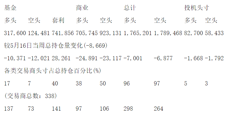 美国商品期货交易委员会(CFTC)最新公布截止5月23日当周NYX原油期货分类持仓报告: 合约单位:1000桶总持仓量:1847901