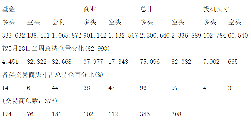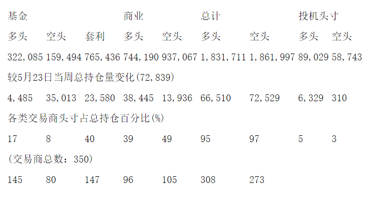 美国商品期货交易委员会(CFTC)最新公布截止5月30日当周NYX原油期货和期权分类持仓报告: 合约单位:1000桶总持仓量:2403429