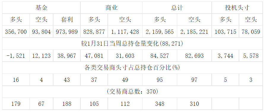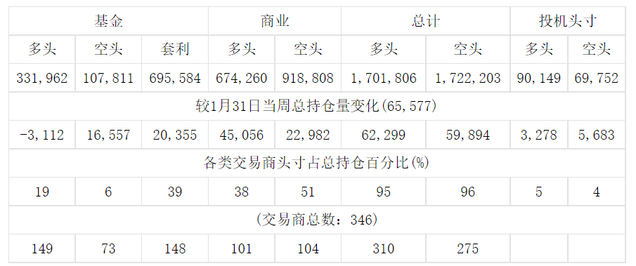 美国商品期货交易委员会(CFTC)最新公布截止2月7日当周NYX原油期货分类持仓报告: 合约单位:1000桶总持仓量:1791955