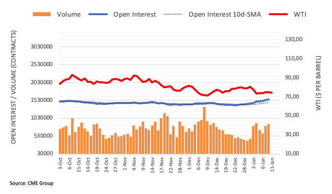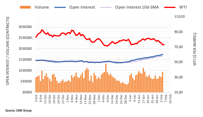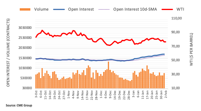芝加哥商业交易所集团原油期货市场的最新数据显示,週一交易员增持原油未平仓合约1.43万份左右,延续自1月20日以来的增势。相反,成交量下降约14.76万份合约,结束两连增。 WTI原油:当前目标为72.50美元 在未平仓合约增加的背景下,WTI原油价格在周一扩大此前跌势。油价可能继续下跌,目标指向72.50美元(1月5日)。