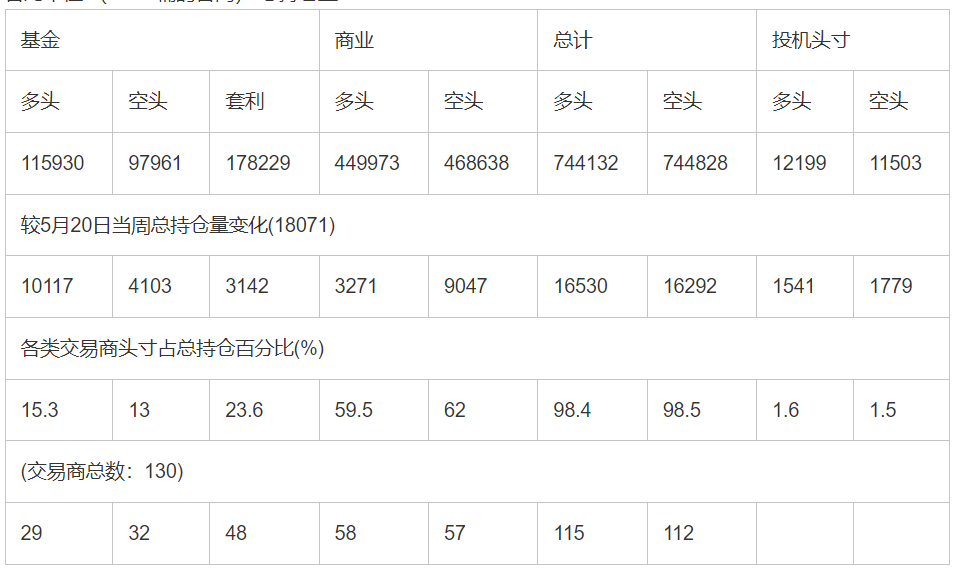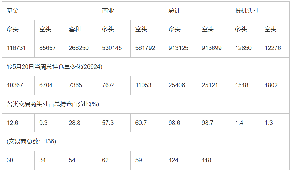 截止5月27日当周洲际交易所(欧洲)原油期货和期权分类持仓报告: 合约单位:(1000桶的合同)总持仓量:925975