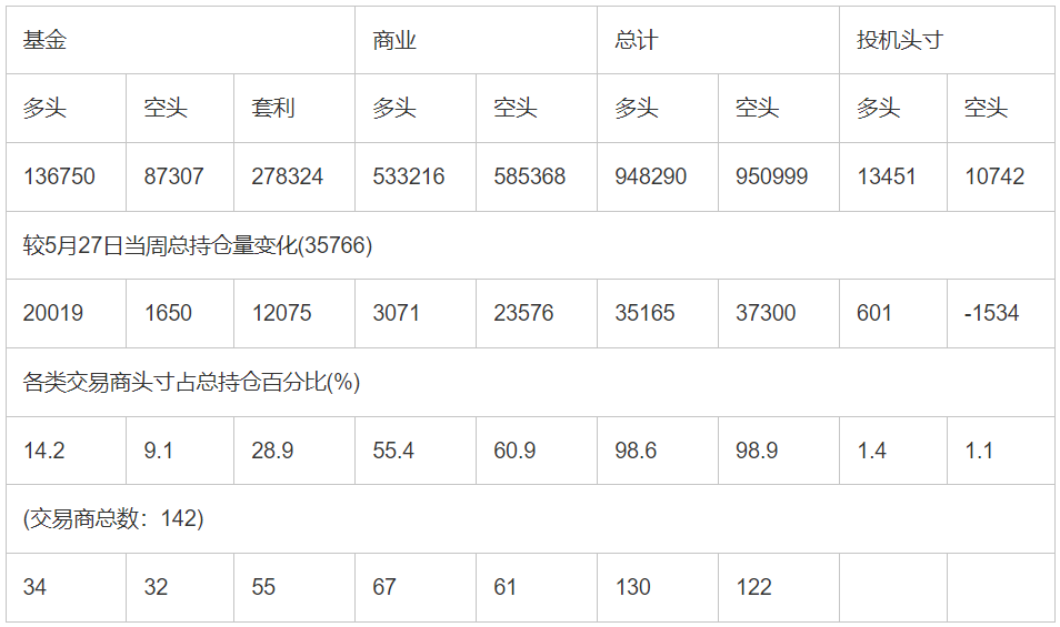 截止6月3日当周洲际交易所(欧洲)原油期货和期权分类持仓报告: 合约单位:(1000桶的合同)总持仓量:961741
