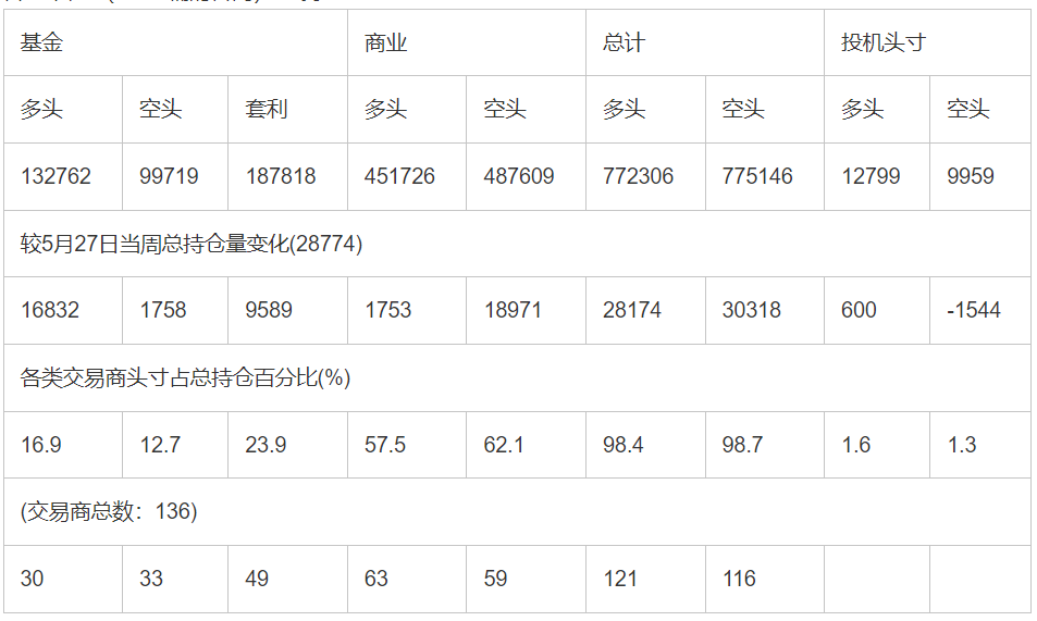 截止6月3日当周洲际交易所(欧洲)原油期货分类持仓报告: 合约单位:(1000桶的合同)总持仓量:785105