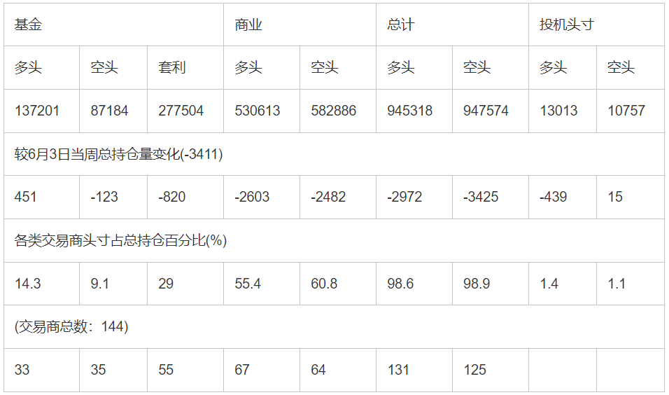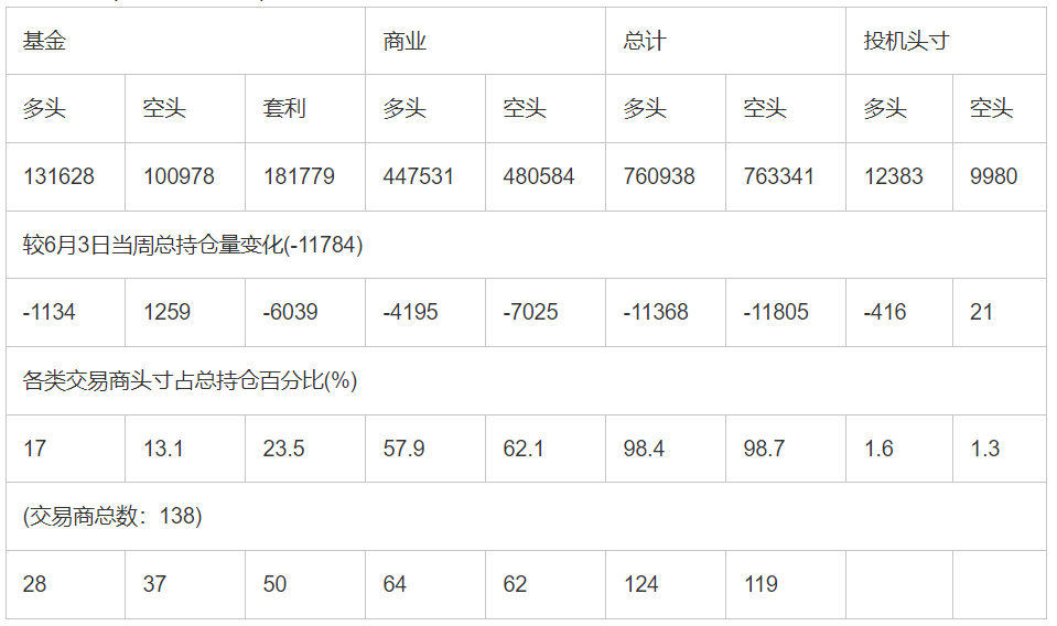 截止6月10日当周洲际交易所(欧洲)原油期货分类持仓报告: 合约单位:(1000桶的合同)总持仓量:773321