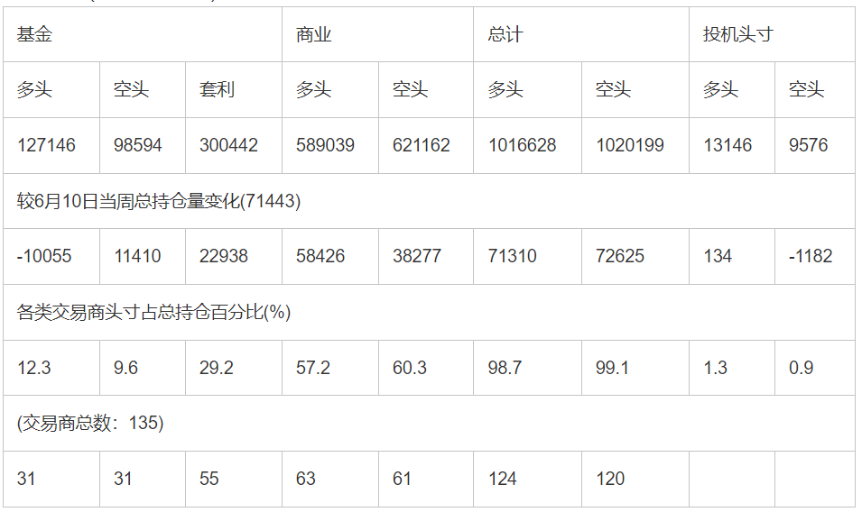 截止6月17日当周洲际交易所(欧洲)原油期货和期权分类持仓报告: 合约单位:(1000桶的合同)总持仓量:1029774