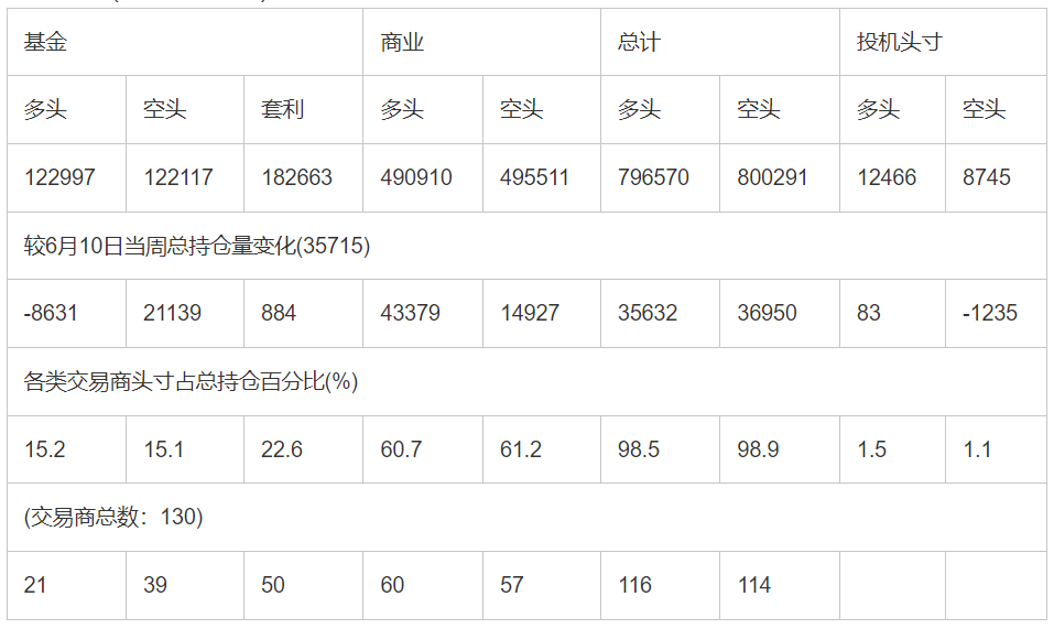 截止6月17日当周洲际交易所(欧洲)原油期货分类持仓报告: 合约单位:(1000桶的合同)总持仓量:809036