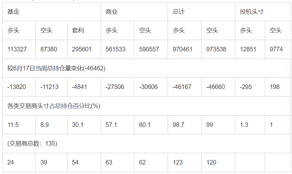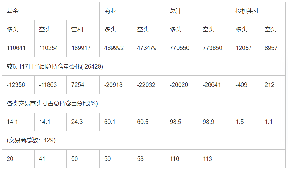 截止6月24日当周洲际交易所(欧洲)原油期货分类持仓报告: 合约单位:(1000桶的合同)总持仓量:782607
