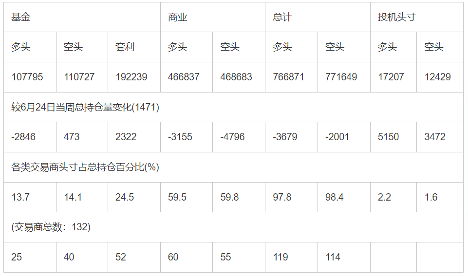 截止7月1日当周洲际交易所(欧洲)原油期货分类持仓报告: 合约单位:(1000桶的合同)总持仓量:784078