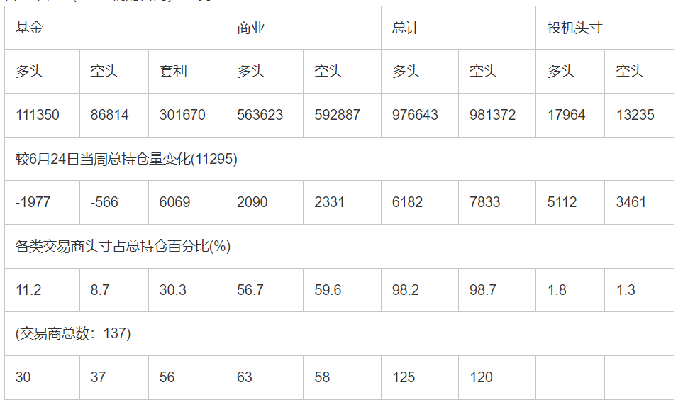 截止7月1日当周洲际交易所(欧洲)原油期货和期权分类持仓报告: 合约单位:(1000桶的合同)总持仓量:994607