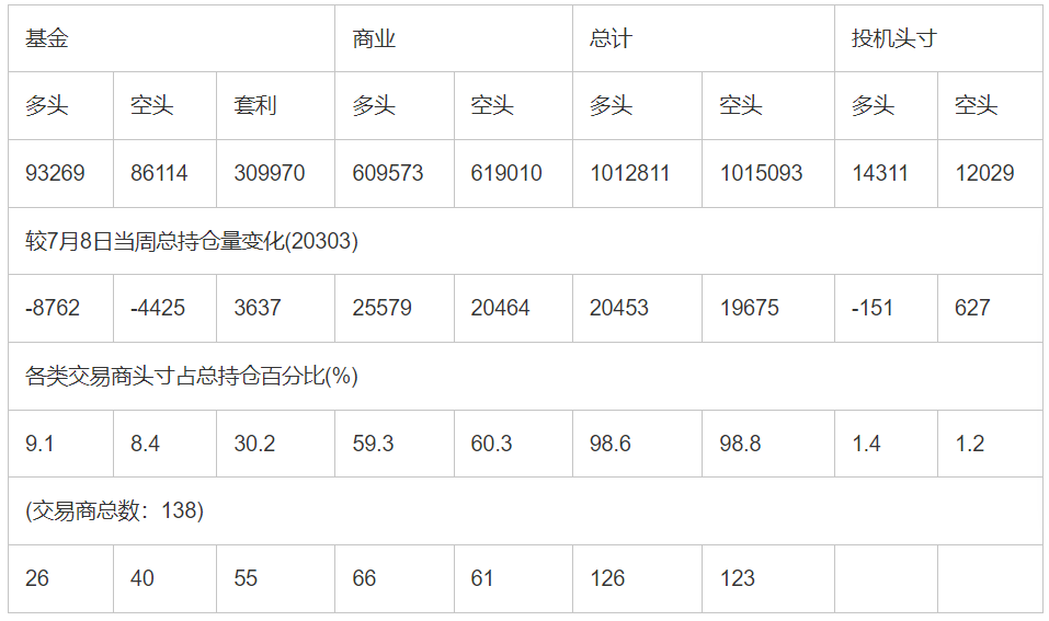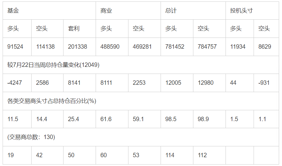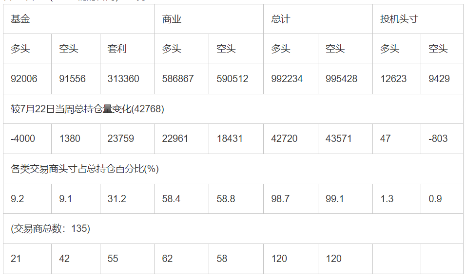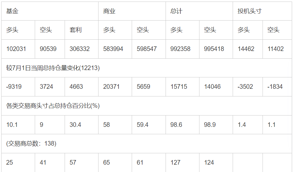 截止7月29日当周洲际交易所(欧洲)原油期货和期权分类持仓报告: 合约单位:(1000桶的合同)总持仓量:1004857