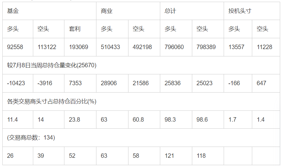 截止7月15日当周洲际交易所(欧洲)原油期货和期权分类持仓报告: 合约单位:(1000桶的合同)总持仓量:1027122