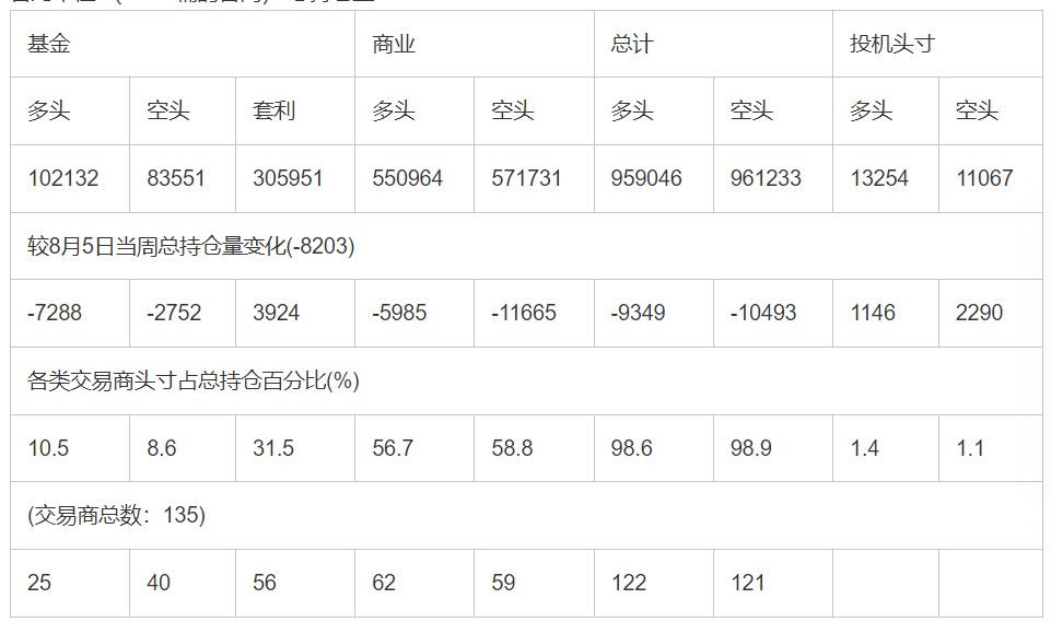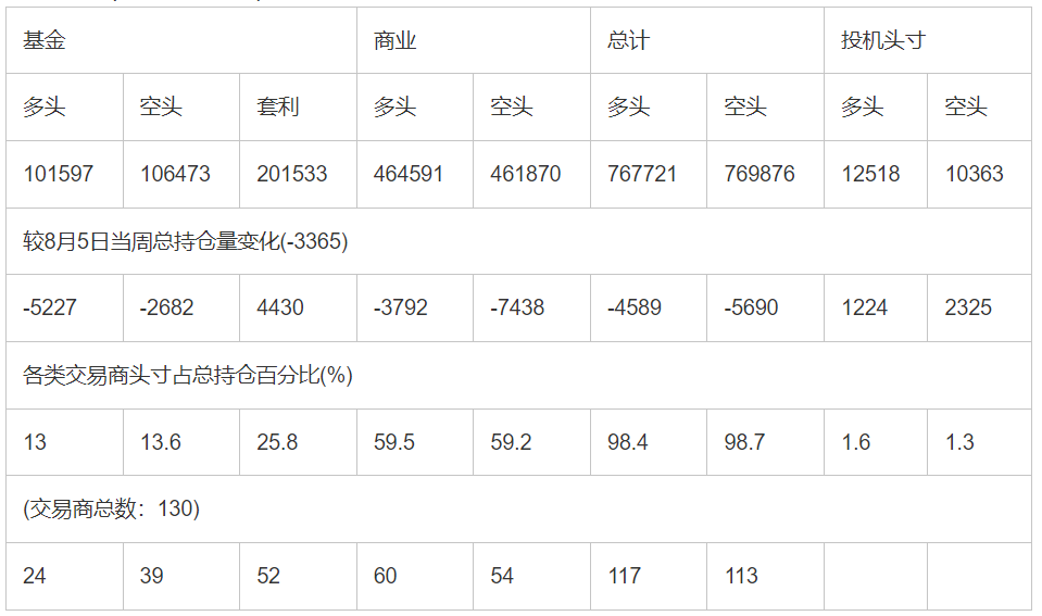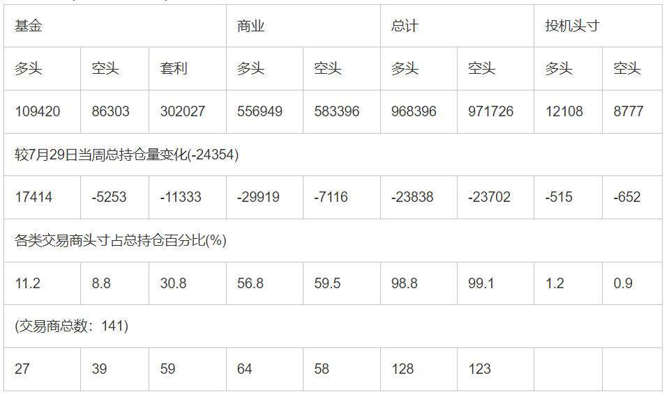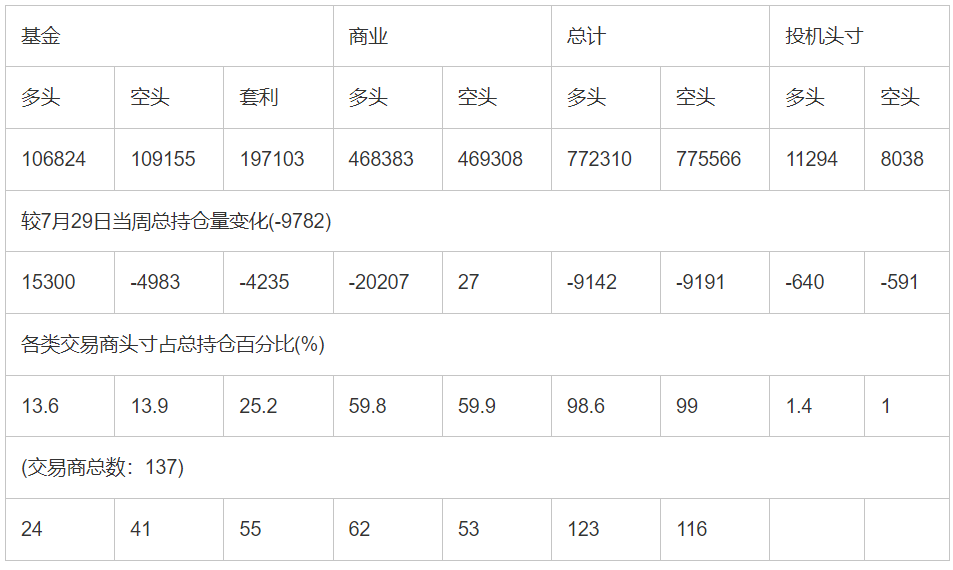 截止8月5日当周洲际交易所(欧洲)原油期货分类持仓报告: 合约单位:(1000桶的合同)总持仓量:783604
