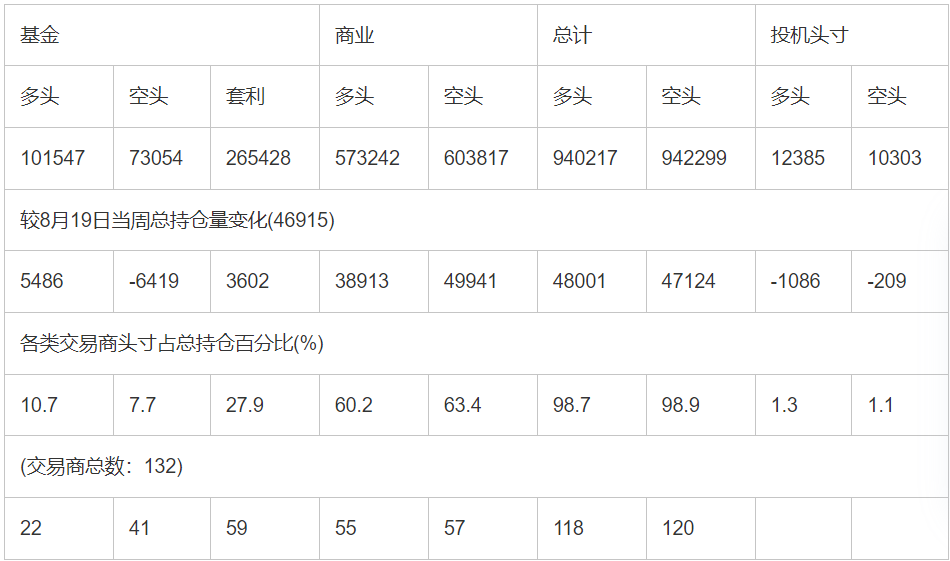 截止8月26日当周洲际交易所(欧洲)原油期货和期权分类持仓报告: 合约单位:(1000桶的合同)总持仓量:952601