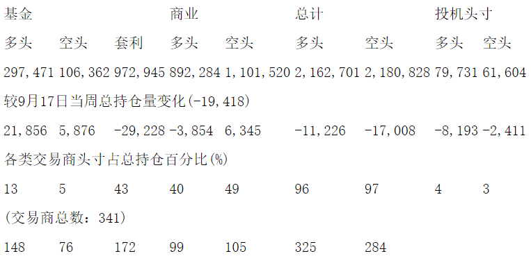 美国商品期货交易委员会(CFTC)最新公布截止9月24日当周NYX原油期货和期权分类持仓报告: 合约单位:1000桶总持仓量:2242432