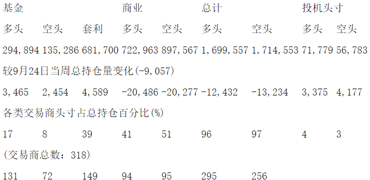 美国商品期货交易委员会(CFTC)最新公布截止10月1日当周NYX原油期货分类持仓报告: 合约单位:1000桶总持仓量:1771336