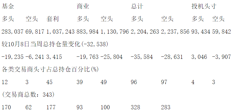 美国商品期货交易委员会(CFTC)最新公布截止10月15日当周NYX原油期货和期权分类持仓报告: 合约单位:1000桶总持仓量:2297698