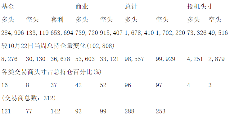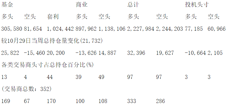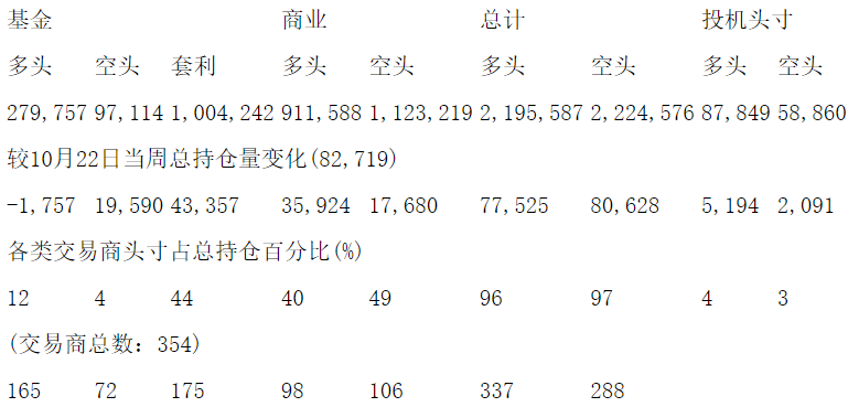 美国商品期货交易委员会(CFTC)最新公布截止10月29日当周NYX原油期货和期权分类持仓报告: 合约单位:1000桶总持仓量:2283436
