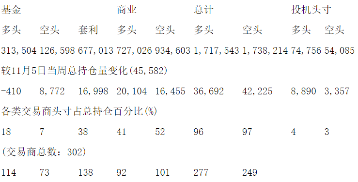 美国商品期货交易委员会(CFTC)最新公布截止11月5日当周NYX原油期货和期权分类持仓报告: 合约单位:1000桶总持仓量:2305168