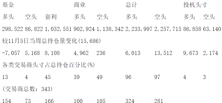 美国商品期货交易委员会(CFTC)最新公布截止11月12日当周NYX原油期货和期权分类持仓报告: 合约单位:1000桶总持仓量:2320854