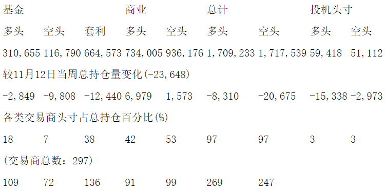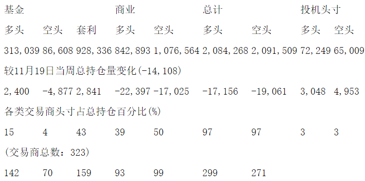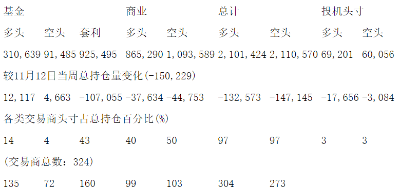 美国商品期货交易委员会(CFTC)最新公布截止11月19日当周NYX原油期货和期权分类持仓报告: 合约单位:1000桶总持仓量:2170626