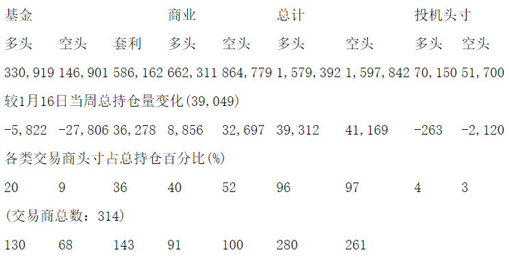 美国商品期货交易委员会(CFTC)最新公布截止1月23日当周NYX原油期货分类持仓报告: 合约单位:1000桶总持仓量:1649542