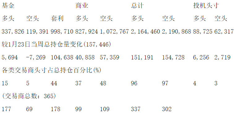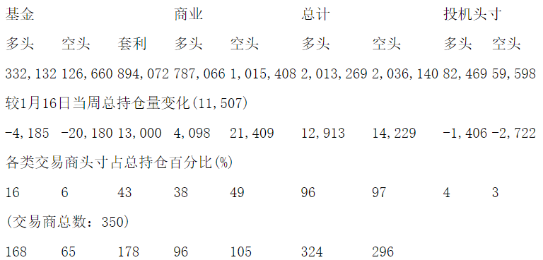 美国商品期货交易委员会(CFTC)最新公布截止1月23日当周NYX原油期货和期权分类持仓报告: 合约单位:1000桶总持仓量:2095738