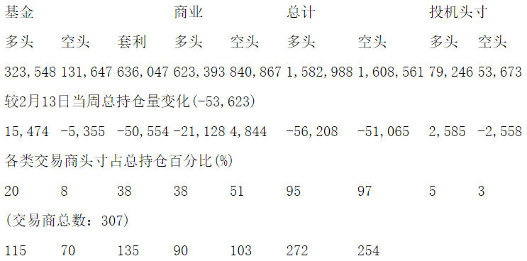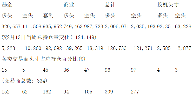 美国商品期货交易委员会(CFTC)最新公布截止2月20日当周NYX原油期货和期权分类持仓报告: 合约单位:1000桶总持仓量:2098421