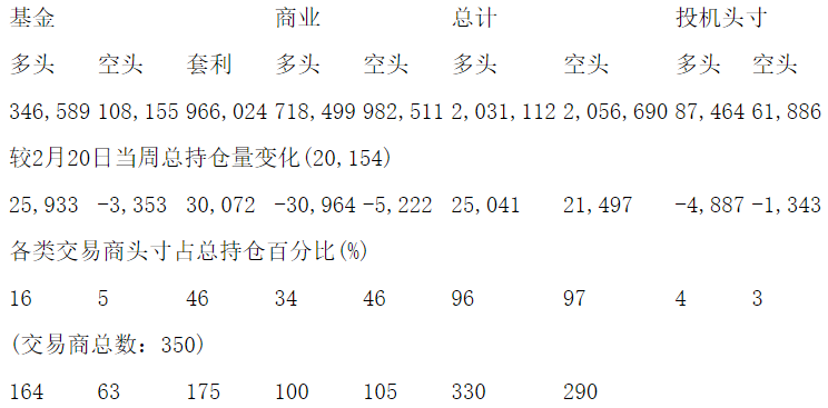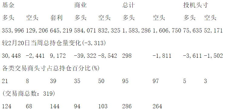 美国商品期货交易委员会(CFTC)最新公布截止2月27日当周NYX原油期货和期权分类持仓报告: 合约单位:1000桶总持仓量:2118576