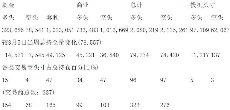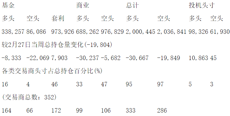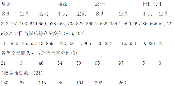 美国商品期货交易委员会(CFTC)最新公布截止3月5日当周NYX原油期货和期权分类持仓报告: 合约单位:1000桶总持仓量:2098772