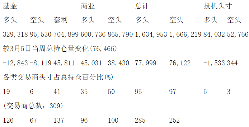 美国商品期货交易委员会(CFTC)最新公布截止3月12日当周NYX原油期货和期权分类持仓报告: 合约单位:1000桶总持仓量:2177329