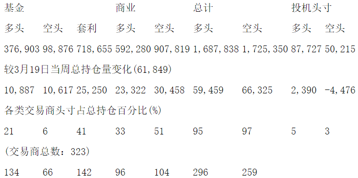 美国商品期货交易委员会(CFTC)最新公布截止3月26日当周NYX原油期货和期权分类持仓报告: 合约单位:1000桶总持仓量:2276002