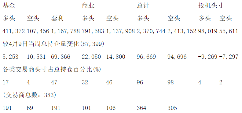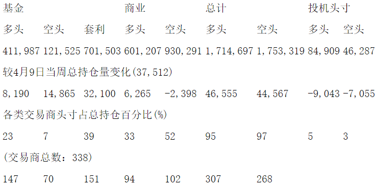 美国商品期货交易委员会(CFTC)最新公布截止4月16日当周NYX原油期货分类持仓报告: 合约单位:1000桶总持仓量:1799606
