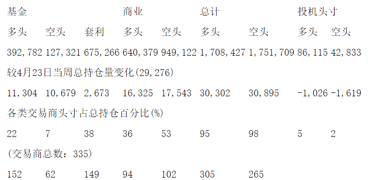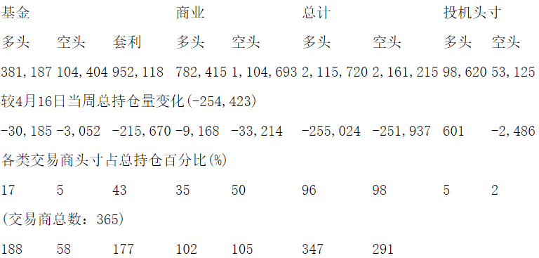 美国商品期货交易委员会(CFTC)最新公布截止4月23日当周NYX原油期货分类持仓报告: 合约单位:1000桶总持仓量:1765266