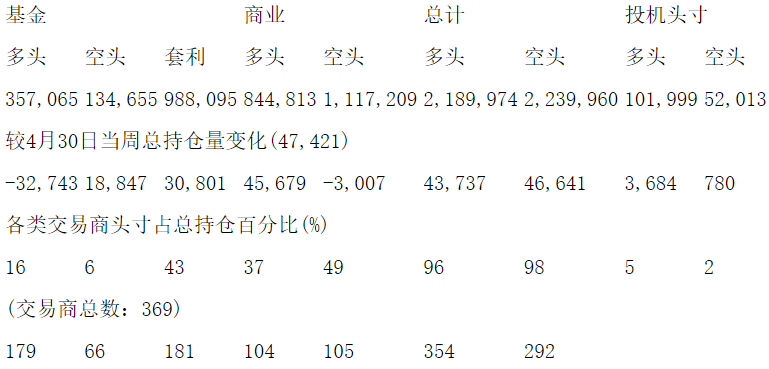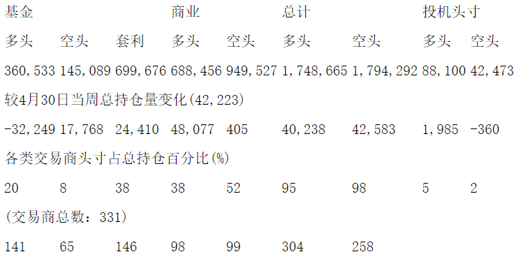 美国商品期货交易委员会(CFTC)最新公布截止5月7日当周NYX原油期货分类持仓报告: 合约单位:1000桶总持仓量:1836765