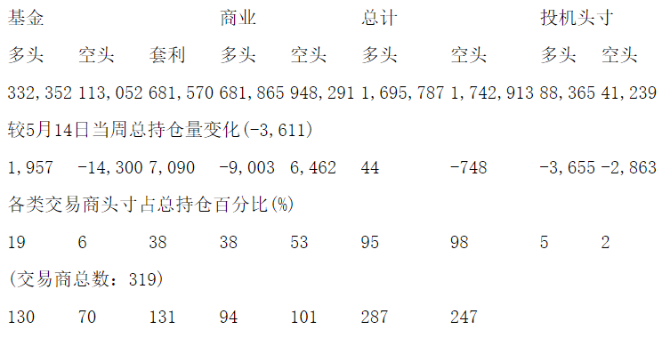 美国商品期货交易委员会(CFTC)最新公布截止5月21日当周NYX原油期货分类持仓报告: 合约单位:1000桶总持仓量:1784152