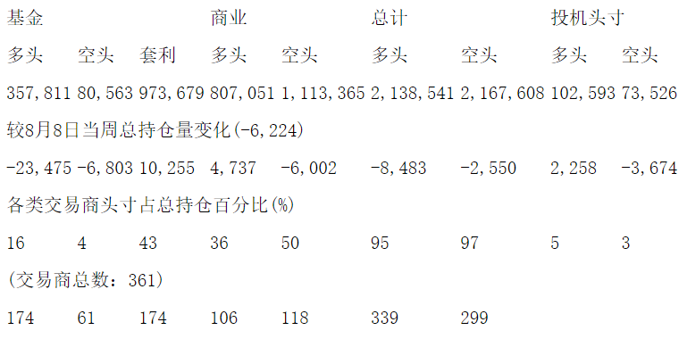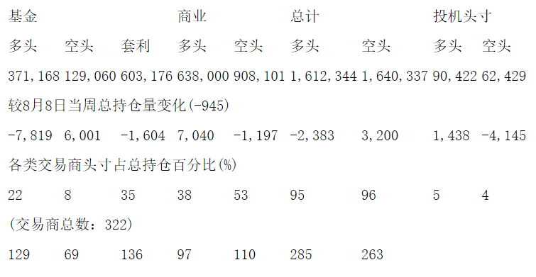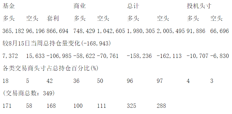 美国商品期货交易委员会(CFTC)最新公布截止8月15日当周NYX原油期货分类持仓报告: 合约单位:1000桶总持仓量:1702766