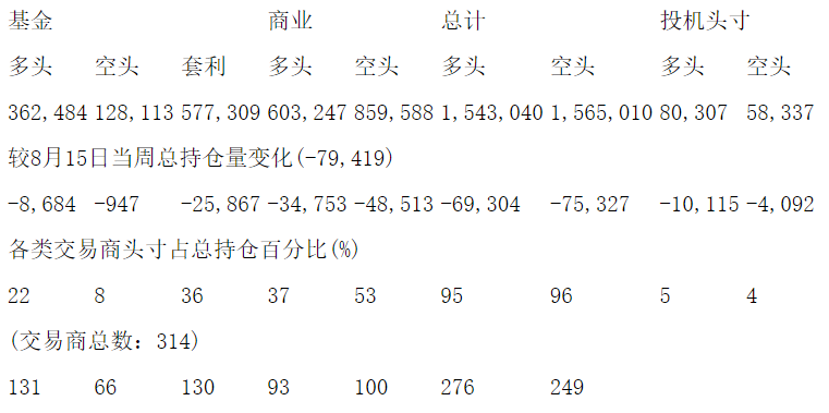 美国商品期货交易委员会(CFTC)最新公布截止8月22日当周NYX原油期货分类持仓报告: 合约单位:1000桶总持仓量:1623347