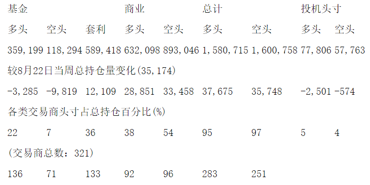 美国商品期货交易委员会(CFTC)最新公布截止8月29日当周NYX原油期货分类持仓报告: 合约单位:1000桶总持仓量:1658521