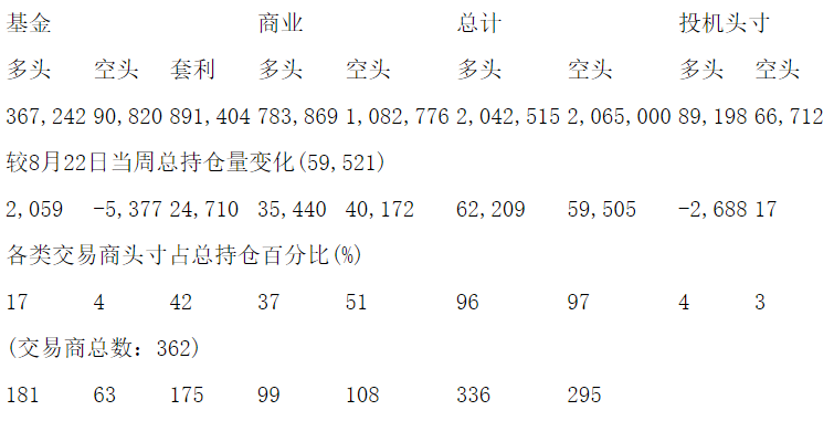 美国商品期货交易委员会(CFTC)最新公布截止8月22日当周NYX原油期货和期权分类持仓报告: 合约单位:1000桶总持仓量:2072191