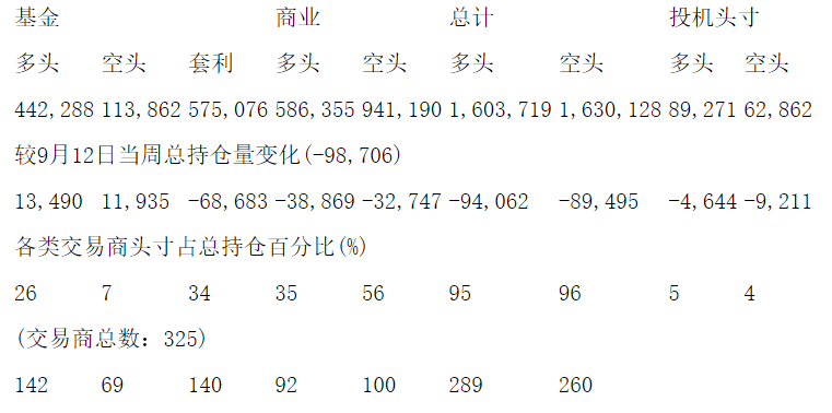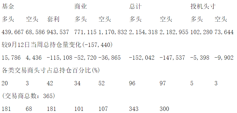美国商品期货交易委员会(CFTC)最新公布截止9月19日当周NYX原油期货和期权分类持仓报告: 合约单位:1000桶总持仓量:2256598