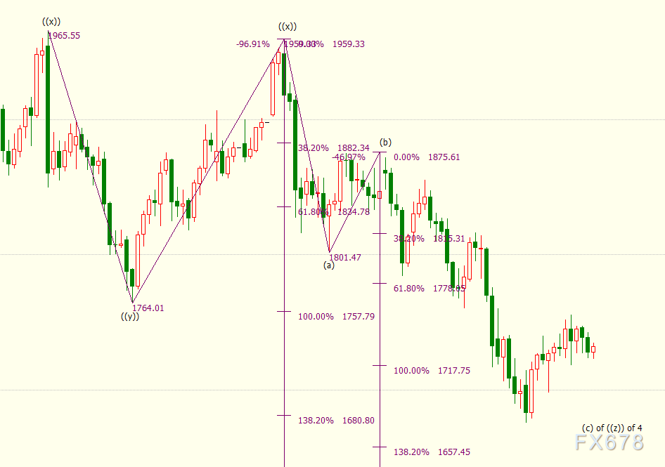 日线上看,iii浪是自1876美元开启的下行(c)浪的子浪,(c)浪的138.2%目标位在1657美元。(c)浪是自1959美元开启的下行((z))浪的子浪。((z))浪的161.8%目标位在1633美元。((z))浪隶属于自2075美元开启的4浪调整走势,4浪呈现((w))((x))((y))((x))((z))三重“之”字调整模式。