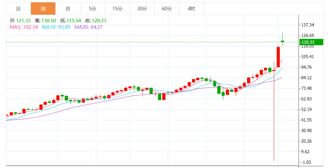 与此同时,美国一则消息引爆油市:美油4月合约涨4.01%报120.32美元/桶,盘中一度涨至130.5美元,涨幅近13%,创2008年以来新高;布油5月合约涨5.07%报124.1美元/桶,盘中一度涨至139.01美元。