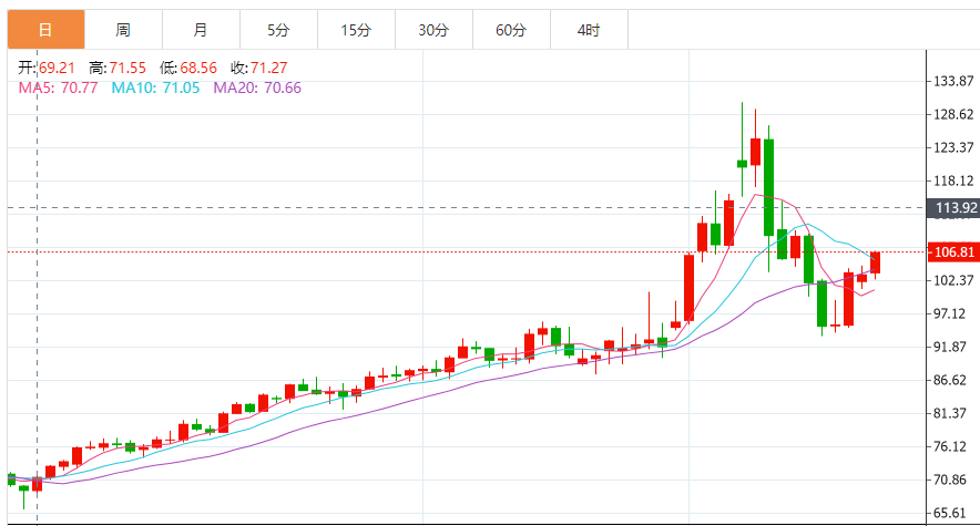 技术日图显示,MACD死叉,但KDJ初步金叉,油价坚守在布林线中轨上方,初步顶破10日均线阻力,短线偏向震荡上攻,目前正试探130-93跌势的38.2%回撤位107.62附近阻力,若能顶破该阻力,则增加短线看涨信号。