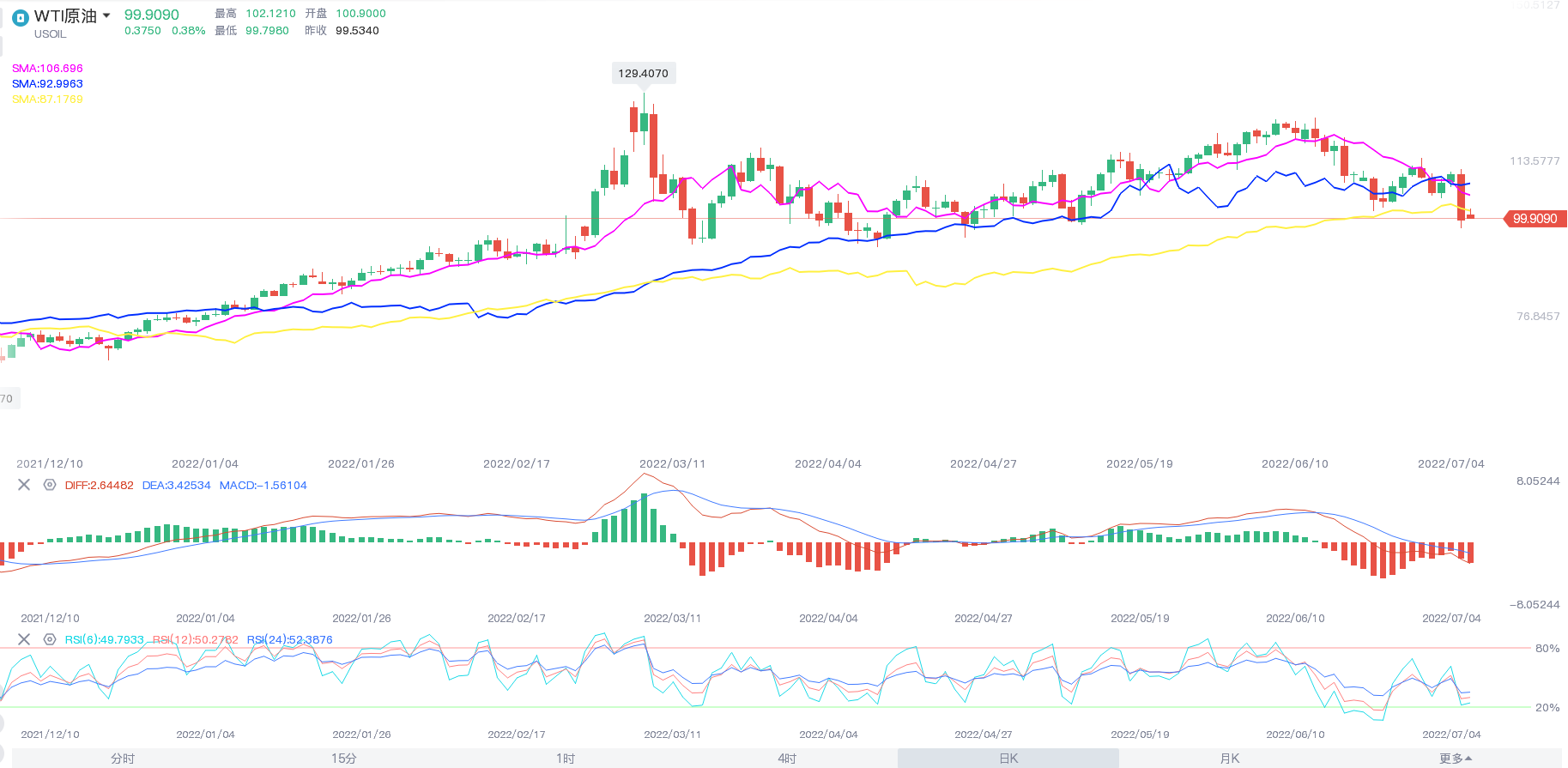 WTI油价继自高位111.42美元跌至低位97.46美元点后,油价WTI油价下跌10.6%,现处在100美元美元附近。 由于市场忧虑全球经济衰退前景和需求减少,挪威石油和天然气工人展开罢工可能会减少原油出口并加剧供应短缺,因此WTI油价周二呈自由落体式下跌。 然而,工会领导人宣布罢工已经结束。