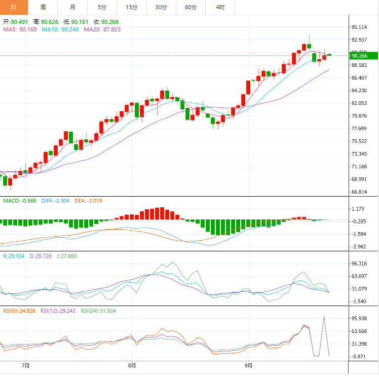 周一亚洲时段,美原油交投于90.20美元/桶附近。过去一周原油走出了高位大幅震荡的表现,调整即将结束一旦放量突破并且站稳91.00一线将会继续震荡上行。上一个交易日先涨后跌再上涨形成窄幅震荡走势,自从原油从高位冲高回落以来一直是处于震荡调整之中。
