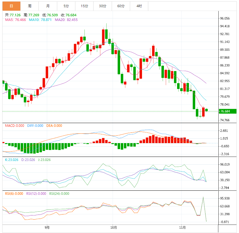 技术面:20期指数移动平均线(EMA)为76.00美元,仍然接近油价,表明表现平平。RSI(14)在40.00-60.00区间波动,呈现横盘趋势。如果油价跌破11月8日接近75.00美元的低点,更多的报价将很有吸引力。油价将进一步下跌至7月18日的低点73.85美元,随后心理支撑为70.00美元。
