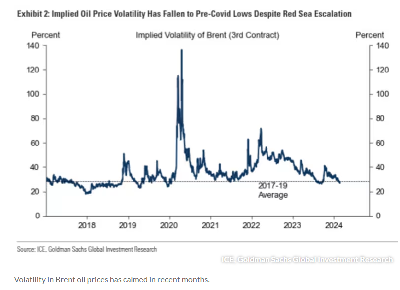 高盛分析师表示,地缘政治风险溢价仅为每桶2美元。他们指出,伊朗支持的胡塞叛军对红海船只的袭击导致保险运输成本上升和运输时间延长,但并未造成供应严重中断。