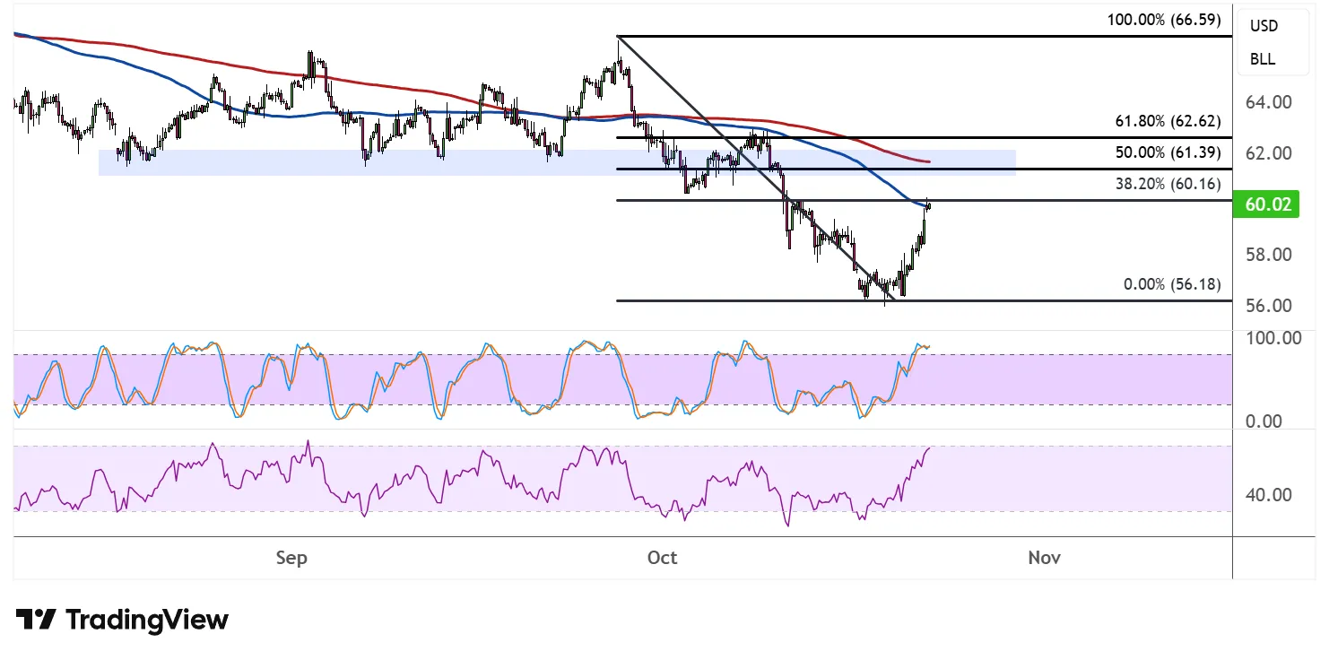 38.2%斐波那契位于60.16美元,而50%水平位于61.39美元。更大的修正可能会达到61.8%斐波那契62.62美元,这与下降通道阻力和100SMA动态拐点重合。该区域可能是看跌回调的沙线。