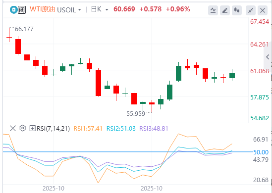 日线图显示,油价延续下降趋势,但前周收盘价反转底部仍有效,中性偏空格局未变。上方阻力聚焦52周均线62.30美元及长期支点63.74美元;下方支撑看61.8%回撤位59.44美元,若失守则关注55.96美元前低支撑。RSI指标徘徊于中性区,暂无超卖信号,暗示抛压仍存。