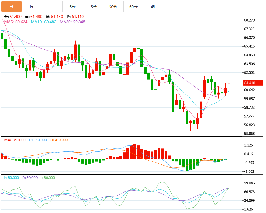美原油12月期货合约经历事件驱动快速反弹后,之后牢牢守住10、20日均线,59.40和58.48关键价位也未触碰到,显示了油价的韧性。原油如能继续维持当前价格水平,则5日线、30日线会下移,并成为支撑,油价有望突破61.30,回归到上箱体,并在上箱体区域运行。